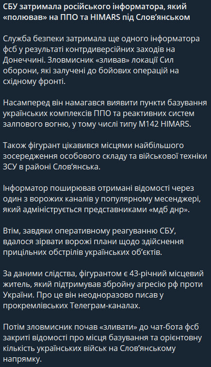 Российский информатор распространял полученные сведения через один из вражеских каналов в мессенджере, администрируемом представителями так называемой "МГБ ДНР".