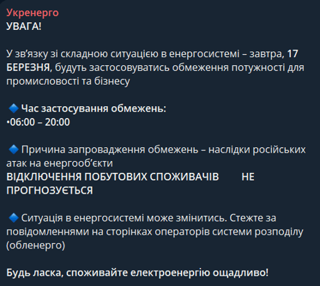 Повідомлення Укренерго. Фото: скриншот