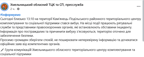 "Сьогодні близько 13:10 на території Кам’янець-Подільського районного ТЦК та СП стався вибух. На місці події працюють рятувальні служби та представники правоохоронних органів, які встановлюють обставини інциденту", — йдеться у повідомленні.
